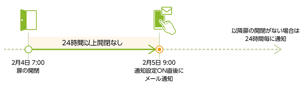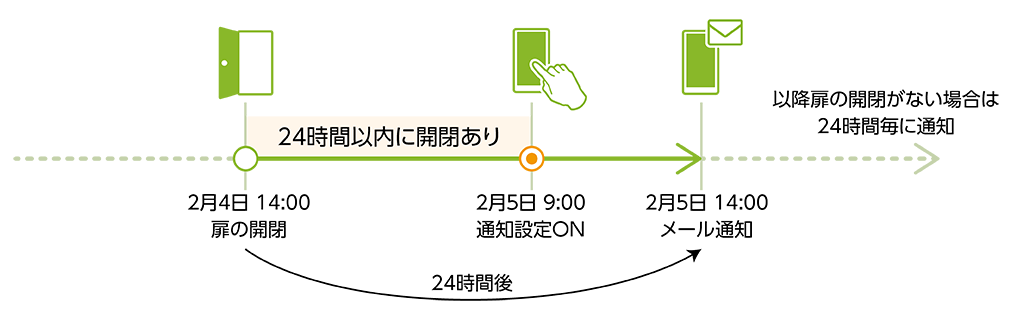 なお、通知設定完了後、初回通知がされるまでの時間は通知設定完了前に扉を開閉した時刻により異なります。(以下イメージ参照)